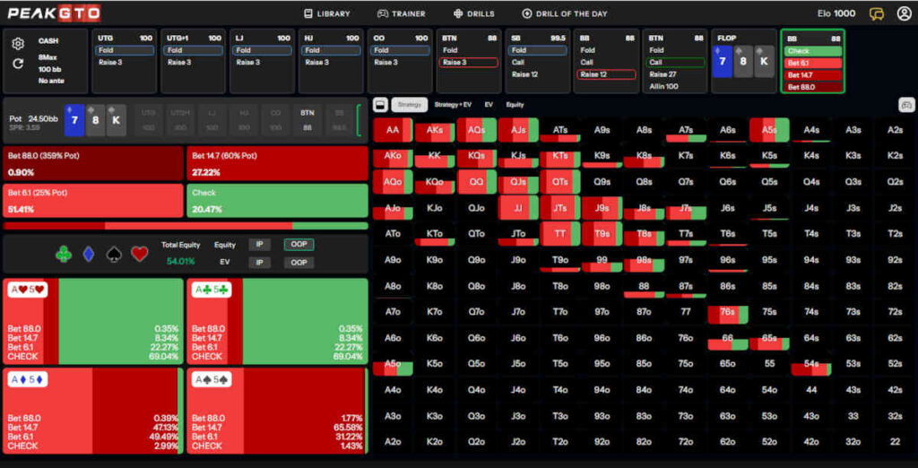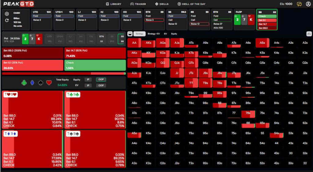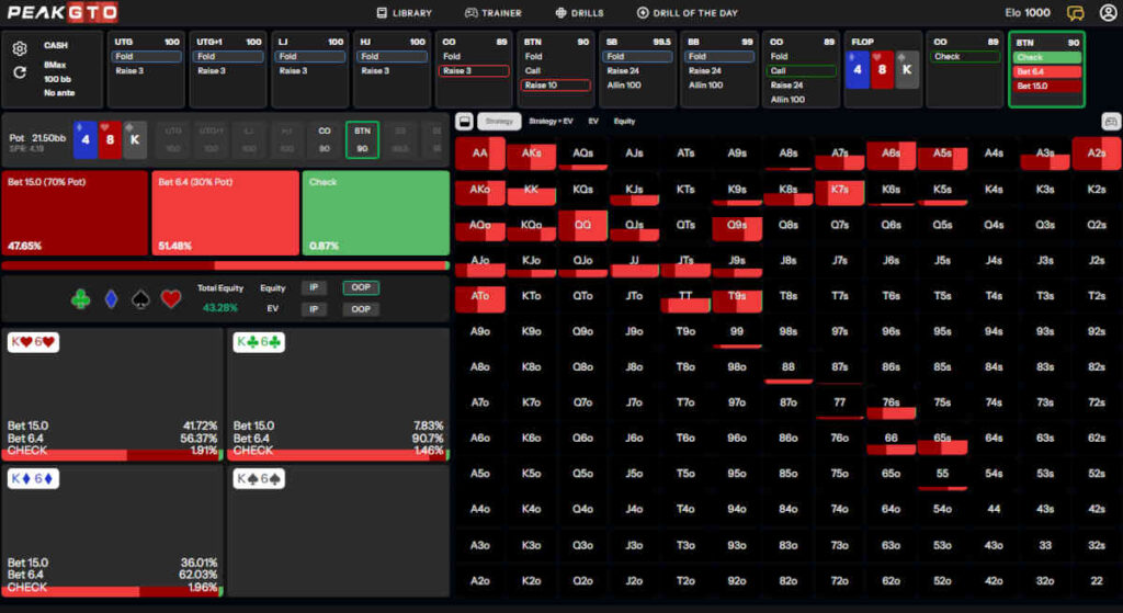 Like before, a game theory optimal strategy means we are splitting our betting and checking frequencies fairly evenly throughout the range. That said, the strongest hands, such as overpairs and top pairs, prefer betting more often and sticking to a larger bet size.