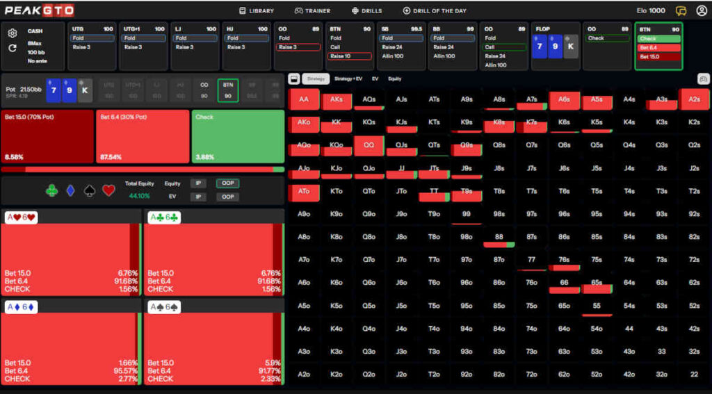 As for sizing, we use smaller bets most often, but still bet on the bigger side one-third of the time. We choose larger sizing for some of our strongest hands, along with a few draws like gutshots.