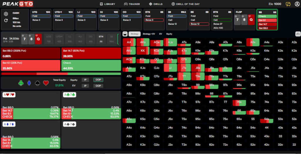 Contrary to king-high boards, other connected high-card flop variations do not favor our range. If we look at an example of Qh8s7s, you will see that now we are only betting 56% of the time.