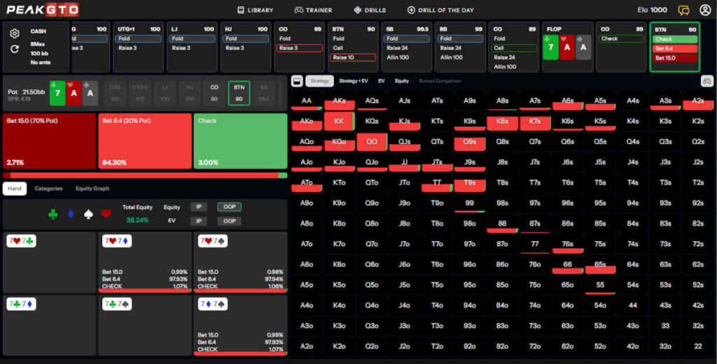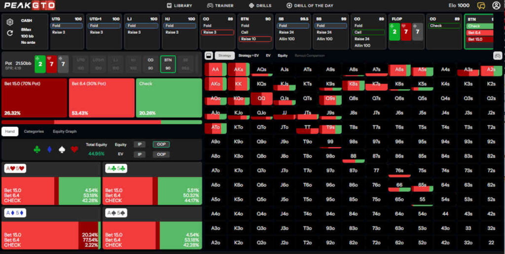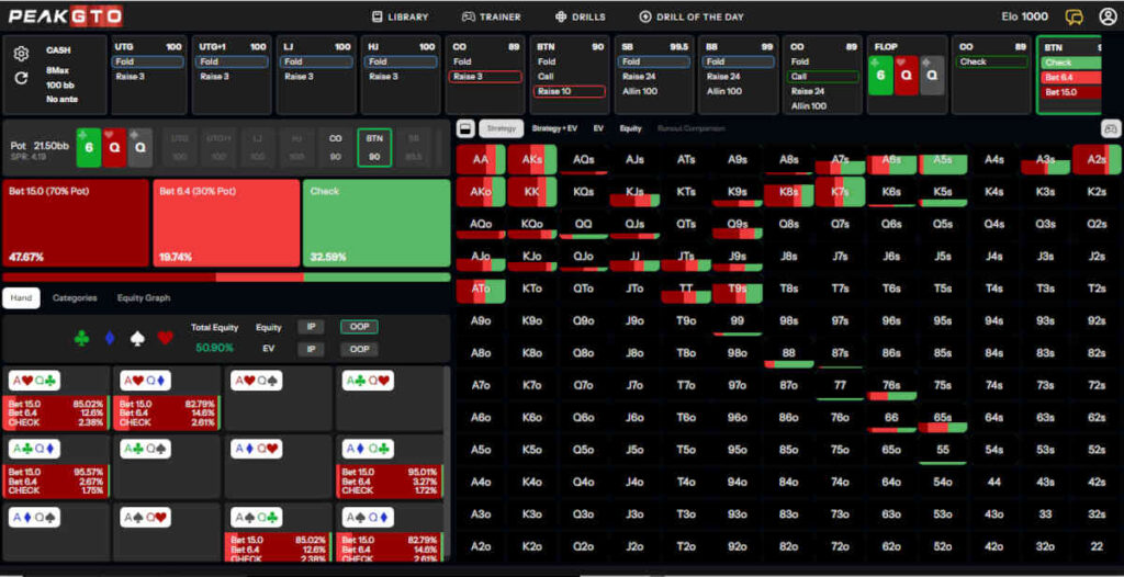 PeakGTO suggests checking just 3% of the time, and betting around one-third of the pot the rest of the time, since we have a big range advantage in this situation.