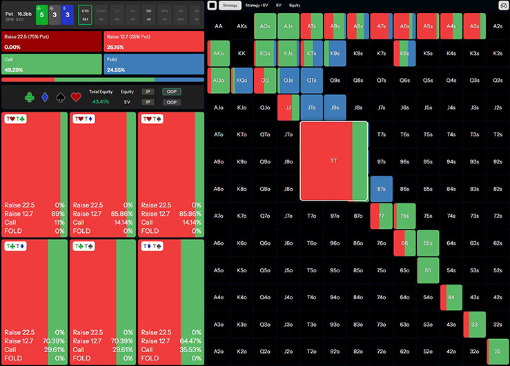 You check your option, the opponent c-bets for $3.20, and the action is on you. In this situation, your range includes many strong hands like J9s, TT, 88, and 77, making it an ideal spot to check raise with all these hands, but also some strong bluffs.