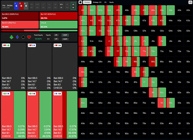 The flop is 9s8h6d. While you could c-bet your set, you should consider the fact that many of the hands in your range don’t have any connection with this board. On the other hand, your opponent’s range connects with this flop heavily.