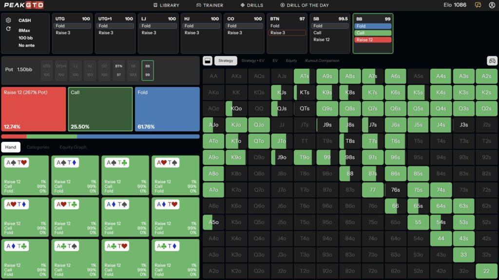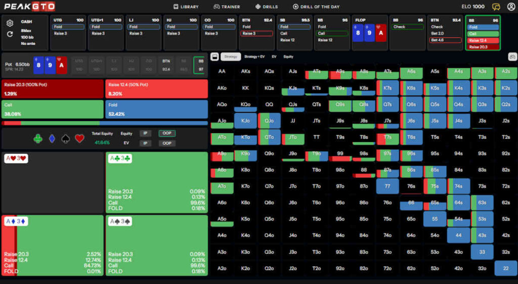 Today, we will use PeakGTO to analyze ace-high flop examples when you call from the BB vs BTN open and see a flop.