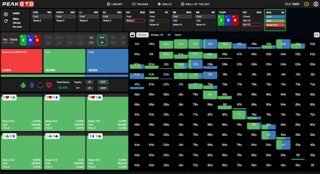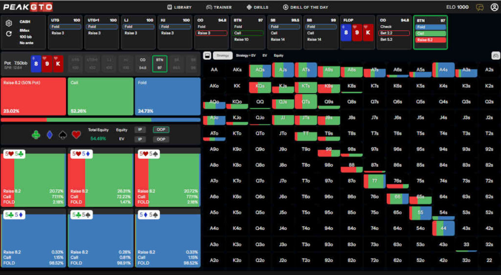 Game theory optimal strategy says that most of our hands will continue with a mixed strategy as well, meaning you will have to call and raise with the same hand at different frequencies. In this exact spot, the solver suggests raising 23% of the time and calling 52% of your hands.