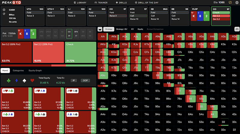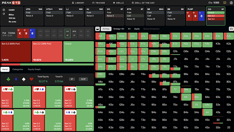 As you can see, the CO will only bet around 21% of the time in this situation and stick to a small sizing in almost all cases. Additionally, he will mix his bets throughout the entire range with similar frequencies.