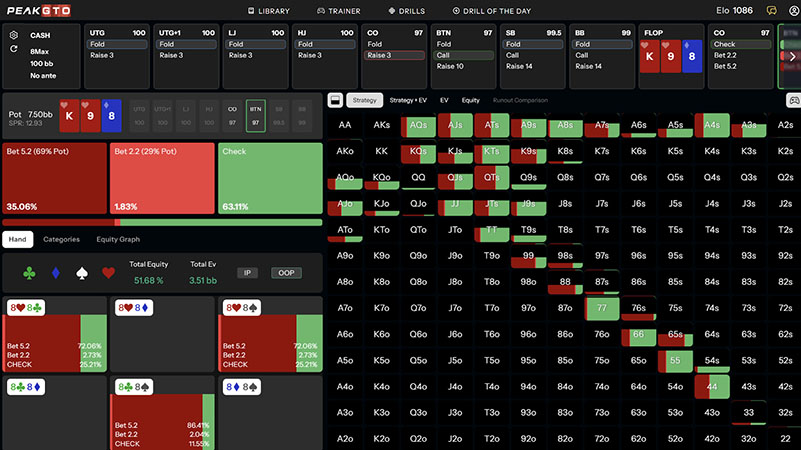 Since these high card boars are really favourable for a preflop aggressor, we will be bet very often. To be more precise, you will be facing a c-bet around 68% of the time according to PeakGTO.