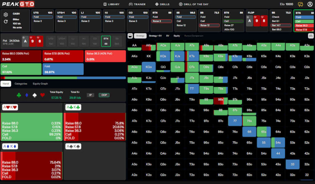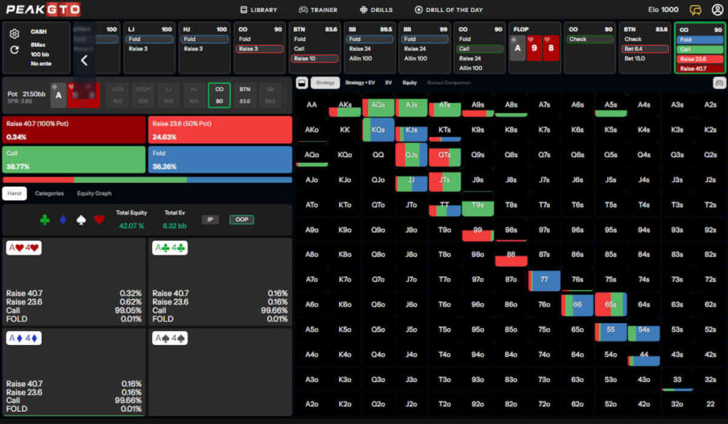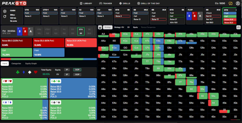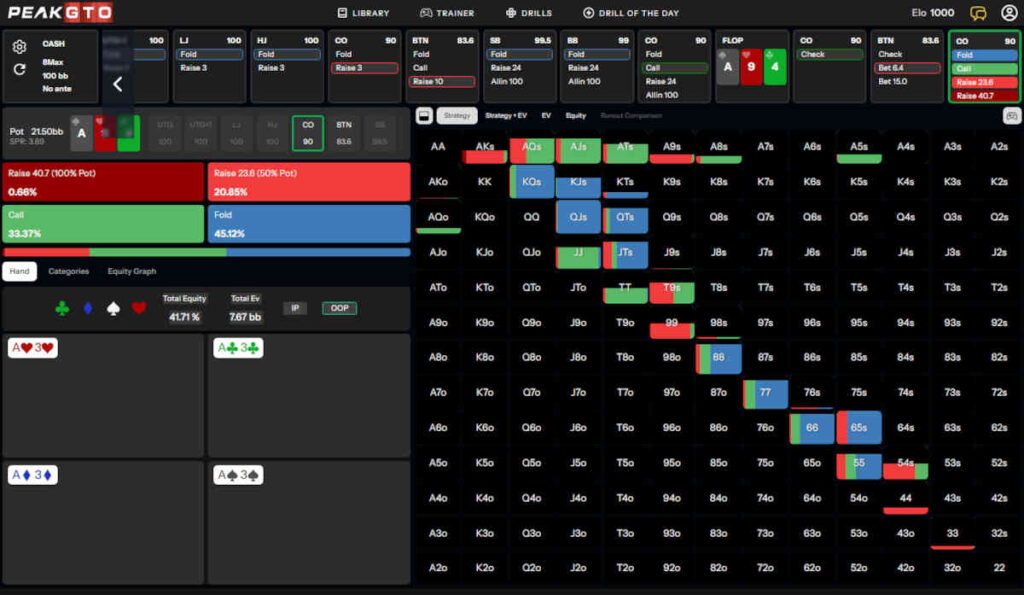 When we face a c-bet, GTO poker says we should defend around 55% of the hands. This includes calling with 33% of the range and raising aggressively with around 22% of the time.