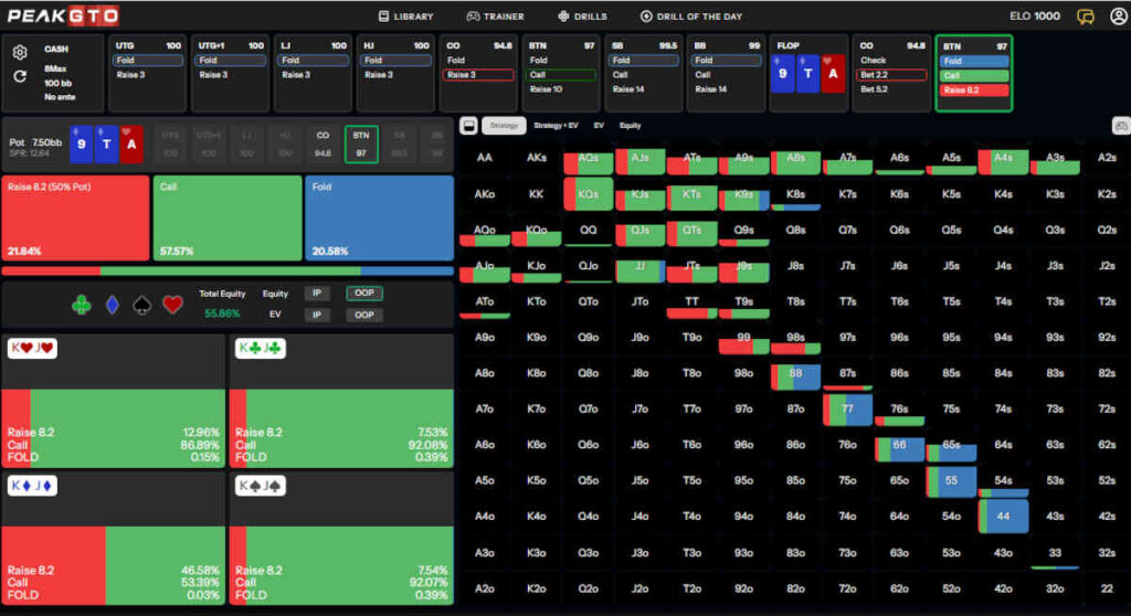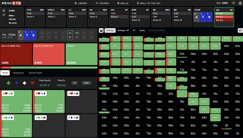 In this situation, PeakGTO suggests betting around 42% of the time, distributing the bets across the range. As far as bet sizing goes: