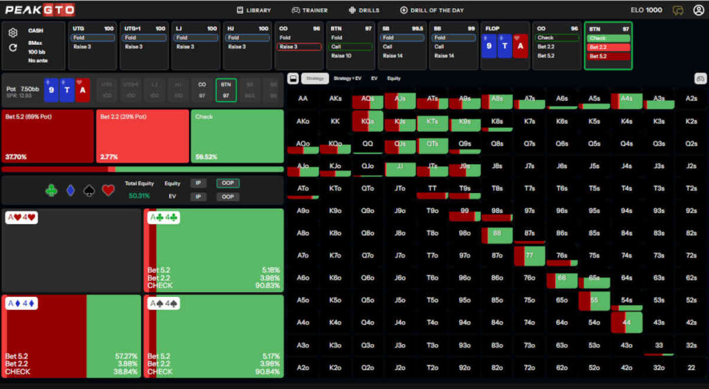 Let’s take a look at the example of As9h4c. First and foremost, the solver suggests CO checking 97% of the time.