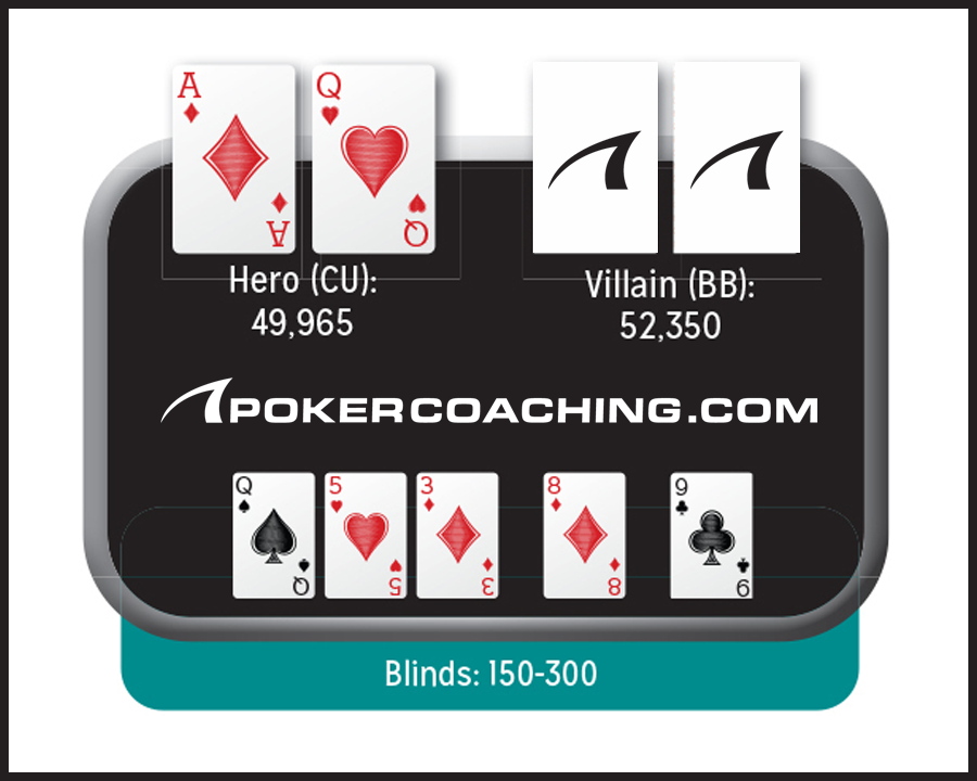 Scenario: You are eight-handed early on in a $5,000 buy-in online tournament and the blinds are 150-300. You are in the cutoff with a stack of 49,965 chips. It folds around to you with A♦-Q♥.