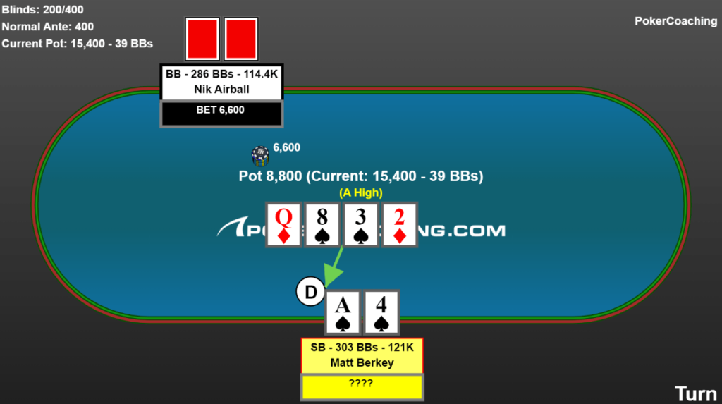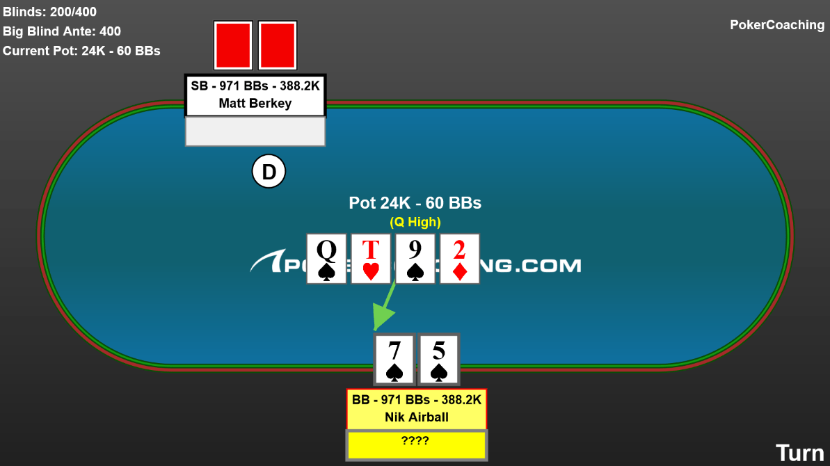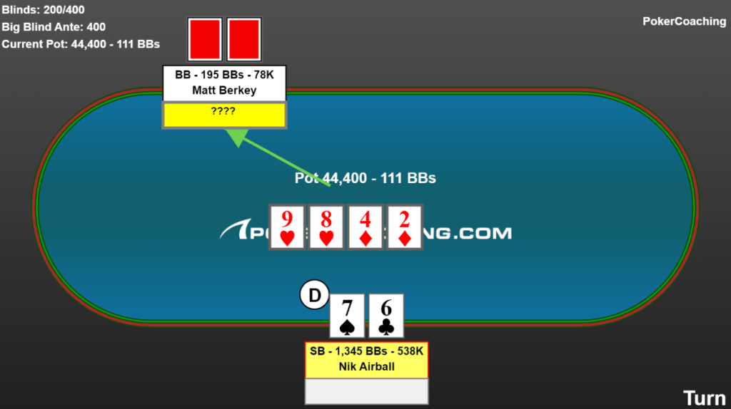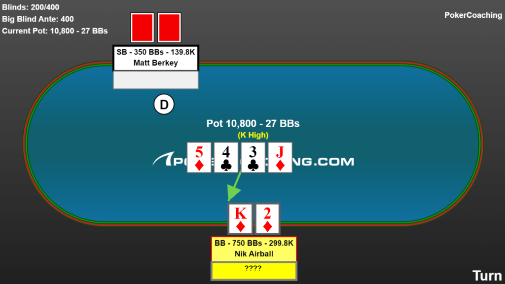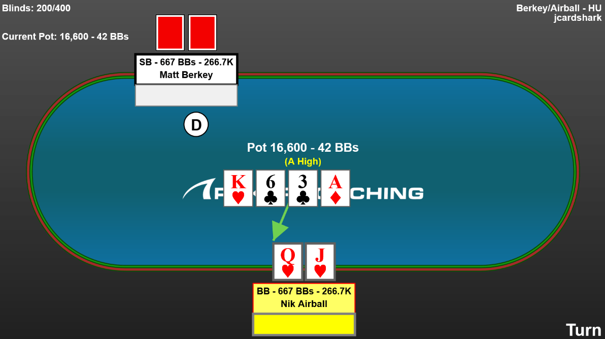 On the flop, a lot of the junk in Berkey’s range was removed when he called Airball’s continuation bet. Despite having more aces in his range on the turn, it was important for Airball to consider that Berkey likely had a decent hand at the least. Airball should have had some checks in his range, but was he in a position to properly continue barreling on the turn?