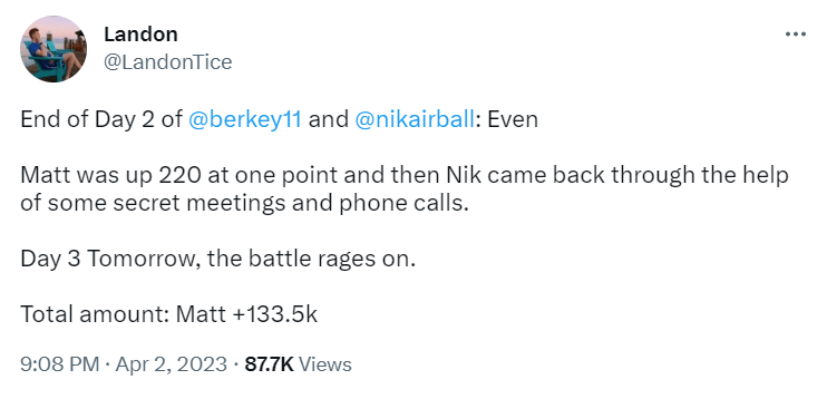 Despite being down over $200,000 at one point during day two of the grudge match, Nik Airball would claw his way back and finished the day even with his adversary Matt Berkey. Although Airball may have attributed his comeback to his natural ability and poker skills, Berkey’s pupil Landon Tice alleged he may have received some assistance from others. At the end of the day, Berkey’s overall lead remained at $133,500, and Tice’s “secret meeting” counter stood at roughly 6.