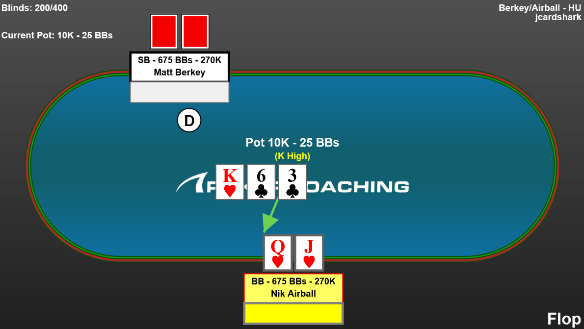 At these stack sizes, the aggressive bets from both players was perfectly standard for heads-up play. With how shallow the stacks became prior to the flop, both Airball and Berkey could have even considered moving all-in preflop. Holding A-K offsuit and facing a “LAG” opponent, Berkey could have strategically elected to simply move all-in preflop to avoid having to play the postflop out-of-position. Along with not having to play out-of-position, moving all-in would have kept Airball from realizing his equity if Berkey happened to pair his ace or king.