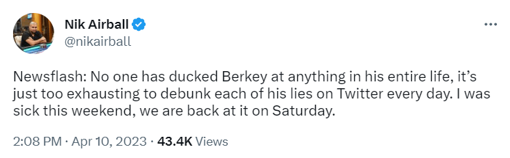 To the dismay of many poker fans who were awaiting further updates from the Twitter accounts of Landon Tice and Eshaan “Brown Balla” Bhalla, the high stakes, heads-up match between Matt Berkey and Nik Airball did not resume this past weekend. On Friday, April 7th, Nik Airball reported from his Twitter account that he was sick and would not be able to compete unless his symptoms subsided. With Nik Airball continuing to be plagued by flu-like symptoms, no further action took place this past weekend.