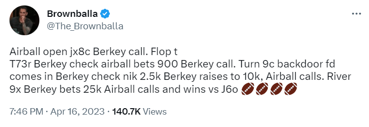 Although Airball claimed the frequent bathroom trips were due to hydration, when Berkey happened to use the bathroom himself, he recounted that Airball was on the phone discussing the match with ally Eshaan “BrownBalla” Bhalla. While Berkey is the only source reporting the alleged “secret bathroom meetings”, it can be confirmed Airball took frequent breaks away from the table, often after losing big hands.