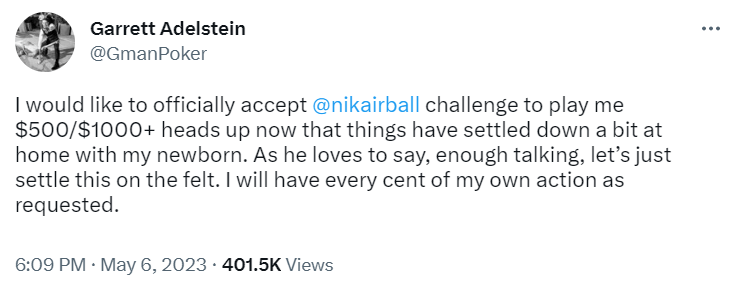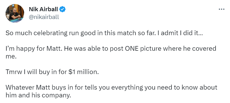 Later in the session on Saturday, May 6th, a set-over-set hand worth over $300,000 would officially bring Nik Airball’s total losses to over $1,000,000. Staying within the stipulations established by arbitrator Phil Galfond, Airball exercised his right to concede the match, making Matt Berkey the official winner.