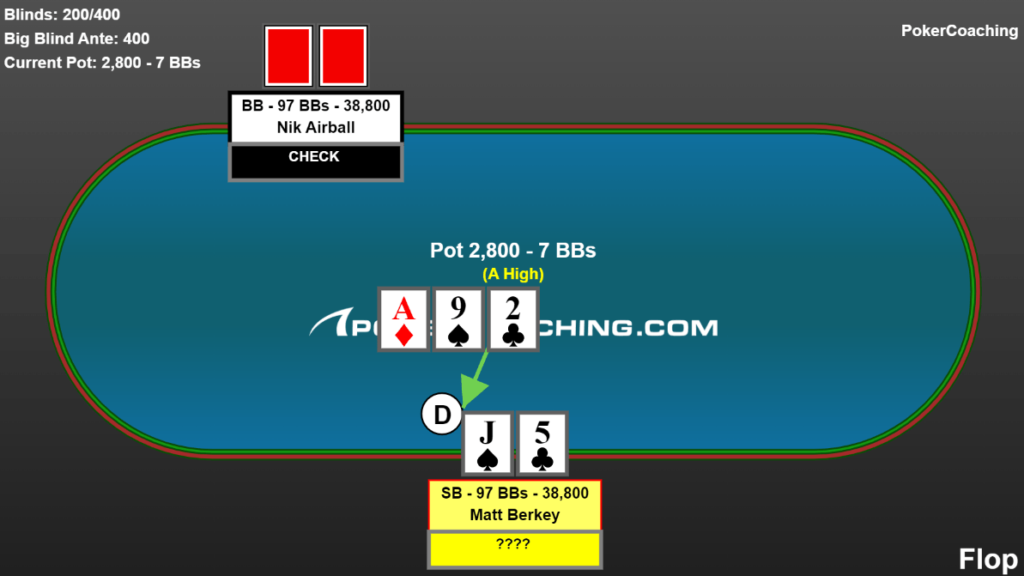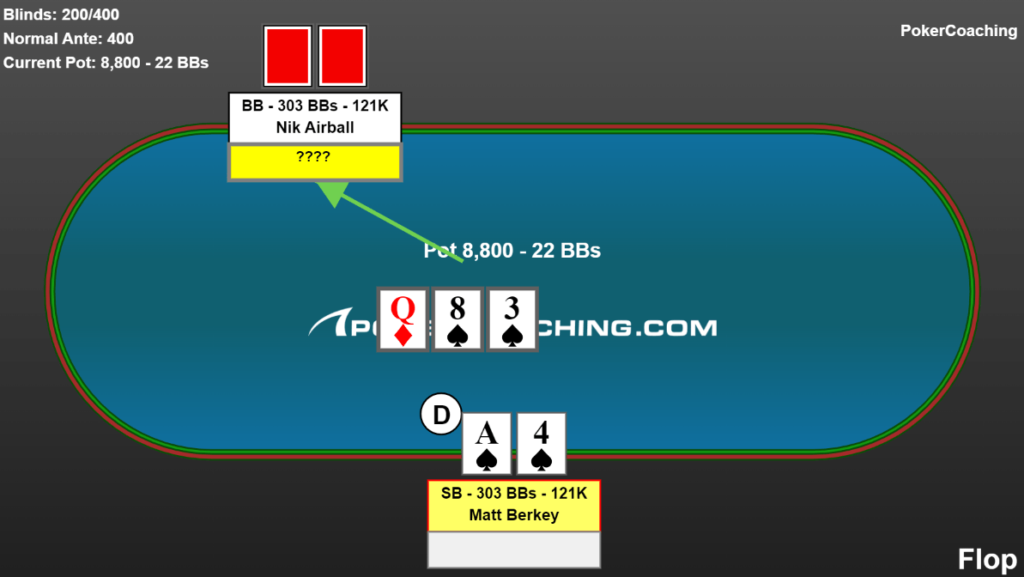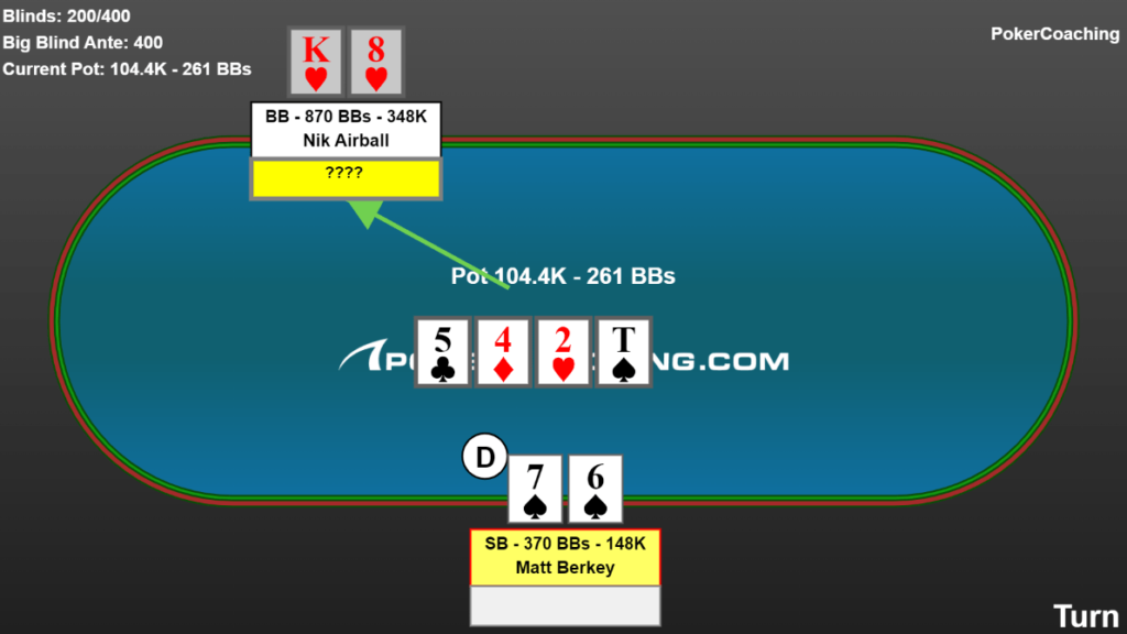 On this low, coordinated board, Airball was in a great position to check-raise as not only did the board connect more with his range than Berkey’s, but he also benefited from an open-ended straight draw. A lot of turn cards could greatly benefit Nik, putting himself in a strategic spot to keep firing.