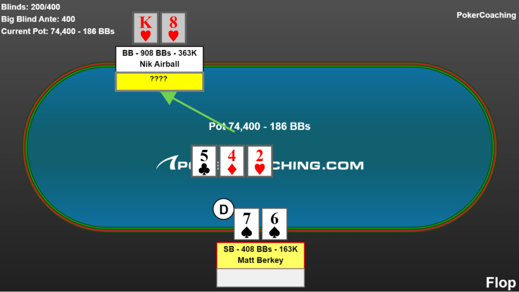As we have seen frequently throughout the match, Matt Berkey continues to mix in junky, offsuit combo hands into his preflop raising range. Raising with 7-4 offsuit preflop, Berkey got the call from Airball and saw a favorable flop.