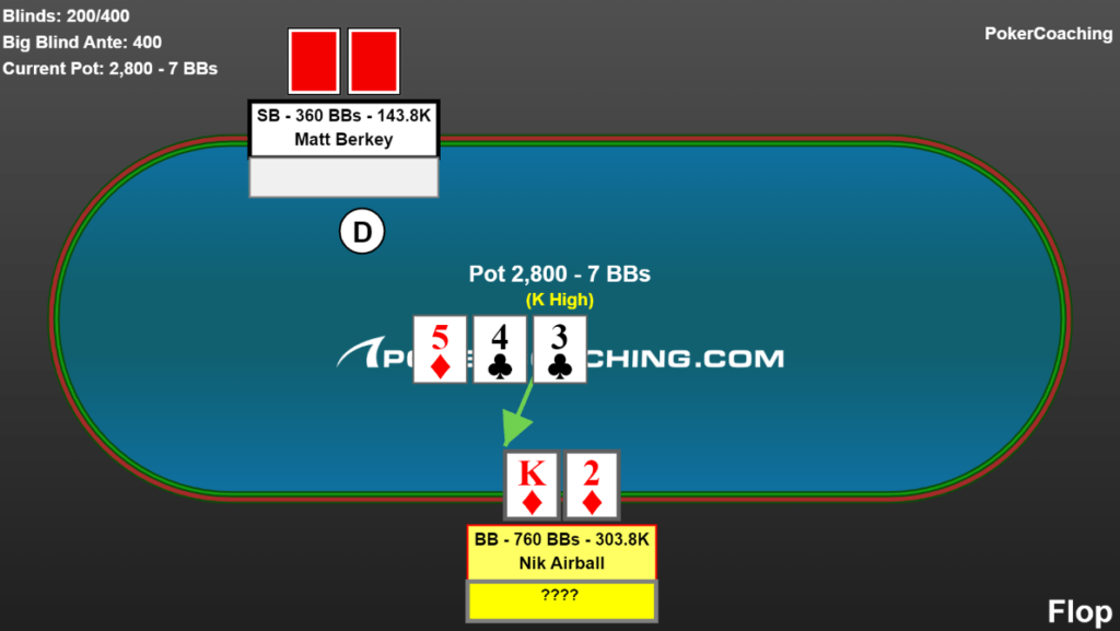 Facing a raise from Matt Berkey preflop, Nik Airball looked down at K♦2♦ and made the call.