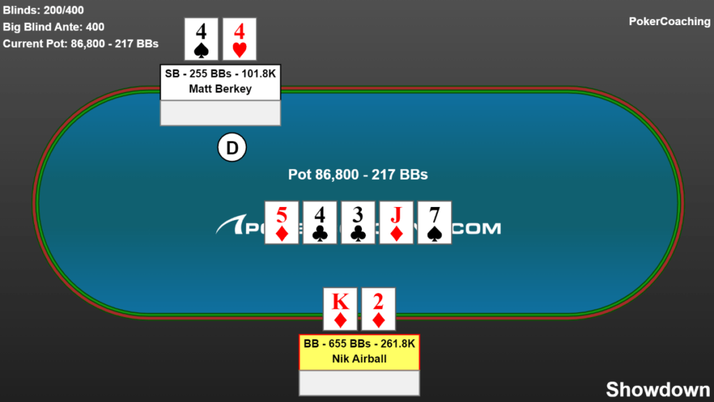 Unfortunately for Airball, Matt Berkey was not going anywhere on the river, having hit a set of fours on the flop. While Berkey could have potentially raised for value in this spot, it was important to consider what worse hands Airball had in his range that would call him. Based on Airball’s play throughout the hand, he either flopped a monster, or a draw that he was continuing to bet. Since Airball was bluffing in this spot, it is unlikely he would have called a raise from Berkey. The only time Nik would call was if he had better sets or flopped/rivered a straight. When your opponent lacks a lot of worse calling hands in their range, there is nothing wrong with simply calling a large bet with good hands. Berkey played his hand well, and dug Nik Airball deeper into a hole in the process.