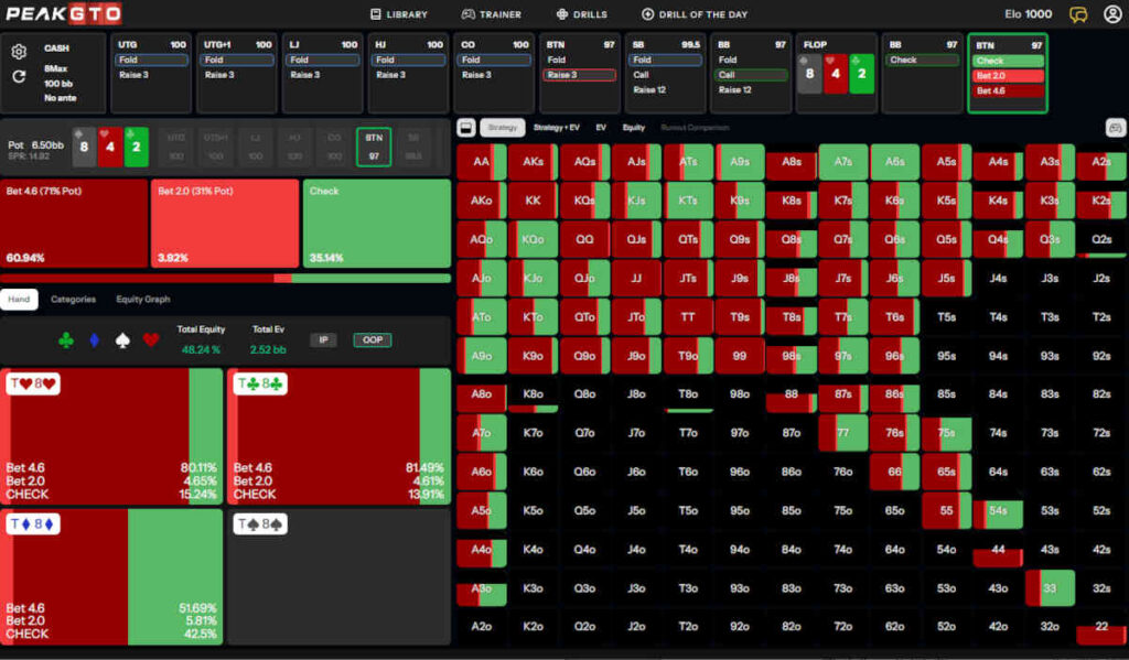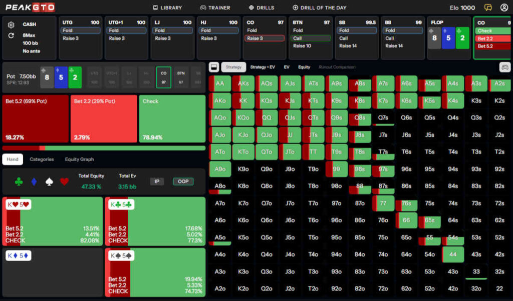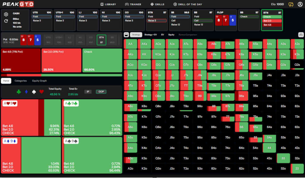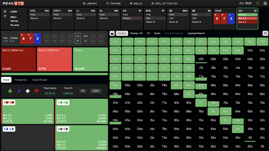 Even on dry board textures, we won’t be betting often OOP. In fact, in this exact situation, we are betting only 21% of the time and sticking to a larger bet size of two-thirds of the pot in most cases.
